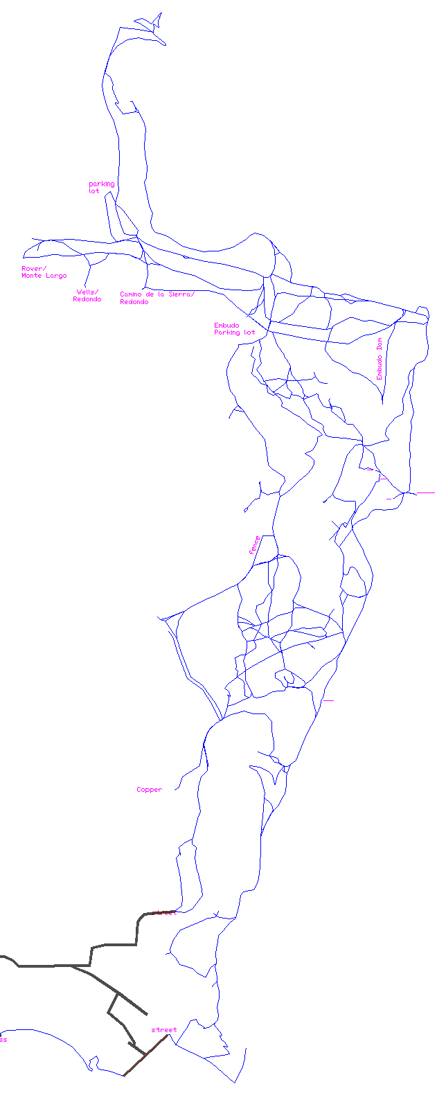 the areas named in the map above, with links to additional information. South Foothills Juan Tabo Basin Four Hills Open Space Four Hills (Route 66 OS) Daisy Maze Tijeras Bio-zone Route 66 Open Space Tres Pistoles (3 Gun) Open Space The Volcanoes Rio Puerco The Bosque Open Space White Mesa San Ysidro Trials Area Red Mesa Placitas Bernillilo Watershed Placitas Open Space Buffalo Tract Crest of Montezuma East Side of the Sandias (non wilderness) Sandia Peak Ski Area Armijo Trails Capulin Peak Tecolote Peak Las Huertas Canyon Overlook Milne/Guiterrez Open Space San Antonito Open Space Ojito Open Space Carlito Spring (hiking only) Golden Open Space La Madera Pipeline Area Cedro/Otero Cedro Peak Area Juan Tomas Open Space (Oak Flats) Pine Flats Tunnel Canyon Sedillo Ridge Otero Canyon David Canyon West Side Edgewood This map is preliminary and has not been proofed. Not all of the trails or notes are on it yet, nor have they been verified. Check back - I will update it as I add to it. If you are interested in helping me with this effort, please contact me. South Sandia Foothills Trails ![]() |