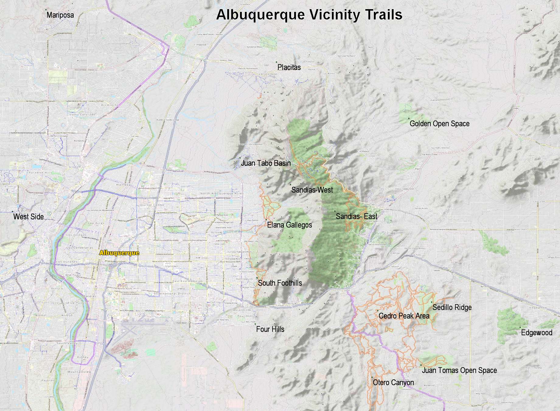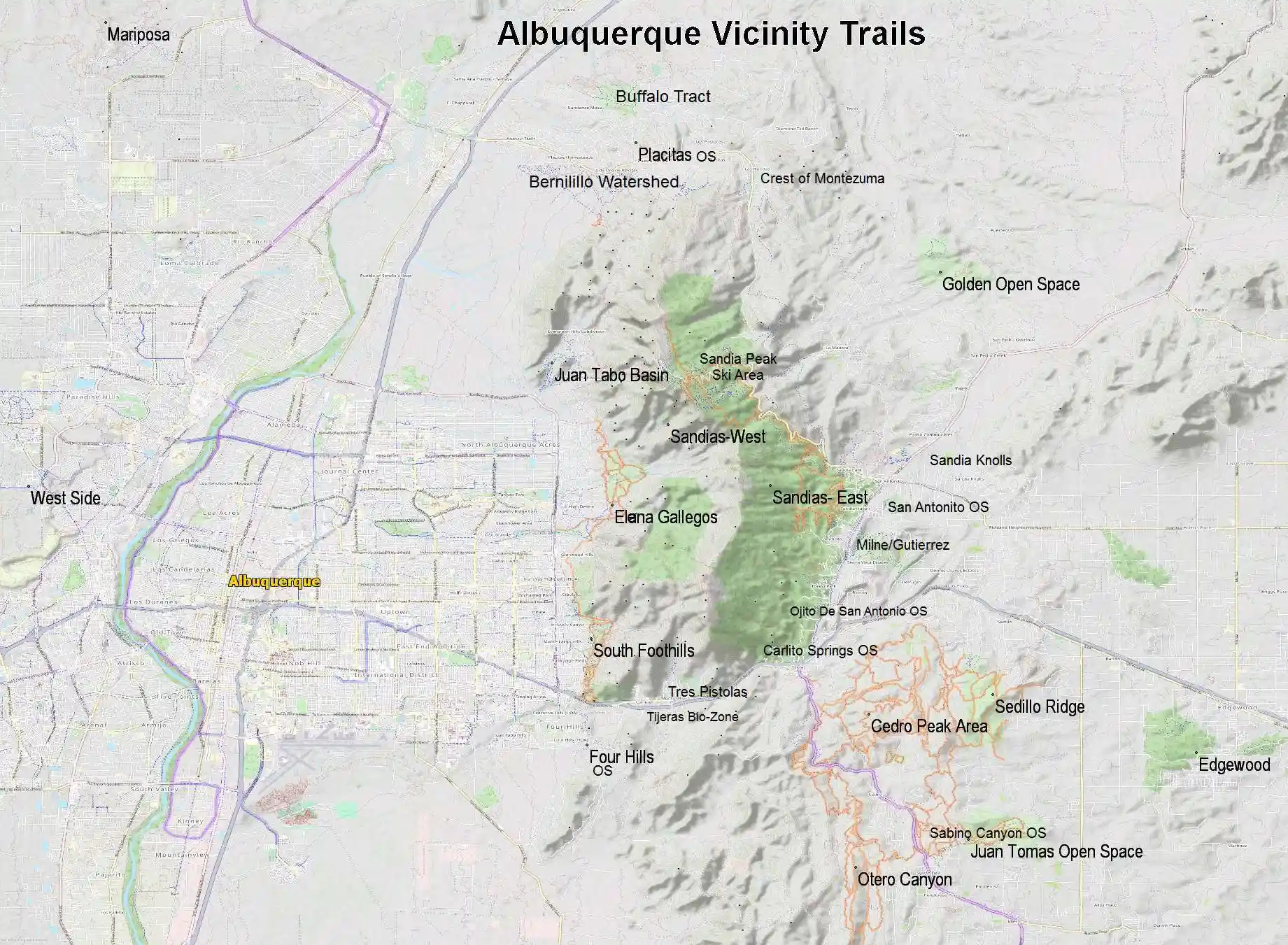 the areas named in the map above, with links to additional information. South Foothills Juan Tabo Basin Four Hills Open Space Four Hills (Route 66 OS) Daisy Maze Tijeras Bio-zone Route 66 Open Space Tres Pistoles (3 Gun) Open Space The Volcanoes Rio Puerco The Bosque Open Space White Mesa San Ysidro Trials Area Red Mesa Placitas Bernillilo Watershed Placitas Open Space Buffalo Tract Crest of Montezuma East Side of the Sandias (non wilderness) Sandia Peak Ski Area Armijo Trails Capulin Peak Tecolote Peak Las Huertas Canyon Overlook Milne/Guiterrez Open Space San Antonito Open Space Ojito Open Space Carlito Spring (hiking only) Golden Open Space La Madera Pipeline Area Cedro/Otero Cedro Peak Area Juan Tomas Open Space (Oak Flats) Pine Flats Tunnel Canyon Sedillo Ridge Otero Canyon David Canyon West Side Edgewood This map is preliminary and has not been proofed. Not all of the trails or notes are on it yet, nor have they been verified. Check back - I will update it as I add to it. If you are interested in helping me with this effort, please contact me. South Sandia Foothills Trails ![]() |